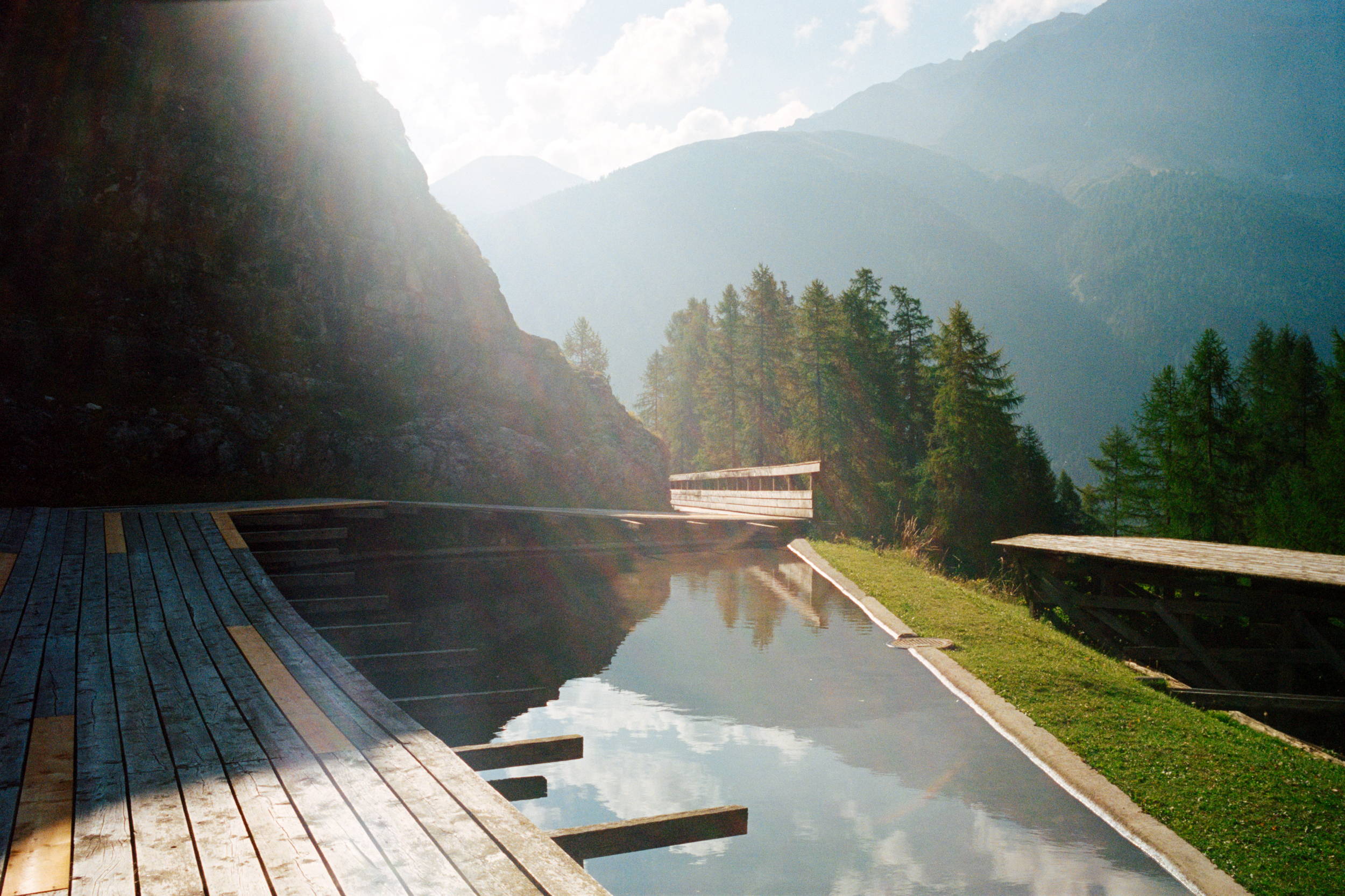 At the end of the path, a direct extension of the sun deck, you will find the rock sauna area with its reflecting pool. This meditative place of calm is located at the foot of Krafthügel Chastlatsch and offers a breathtaking view of the surrounding forests and mountain peaks. Just like the sun deck and the wooden path, the sauna and pool were also designed by the Japanese artist Tadashi Kawamata.