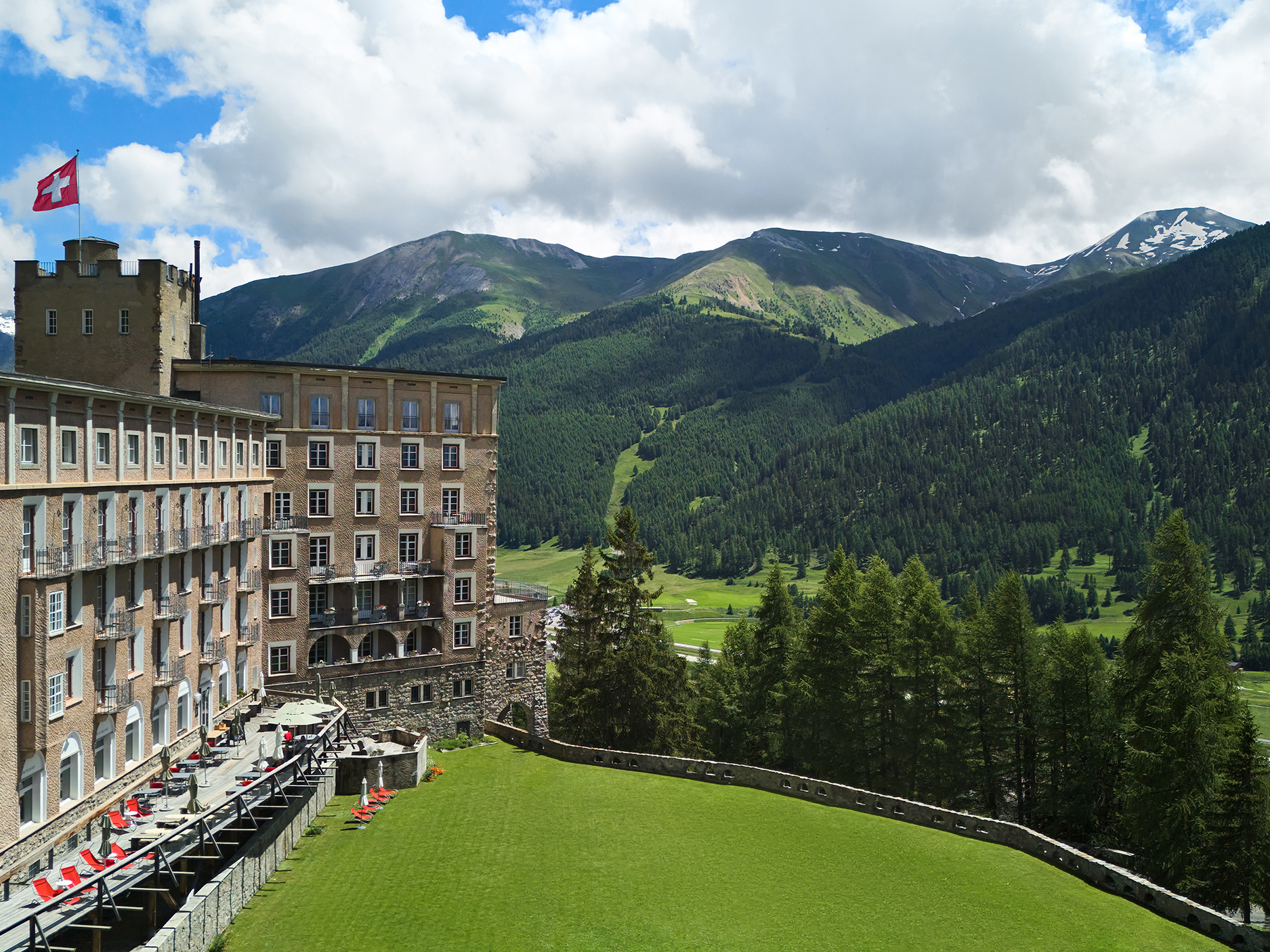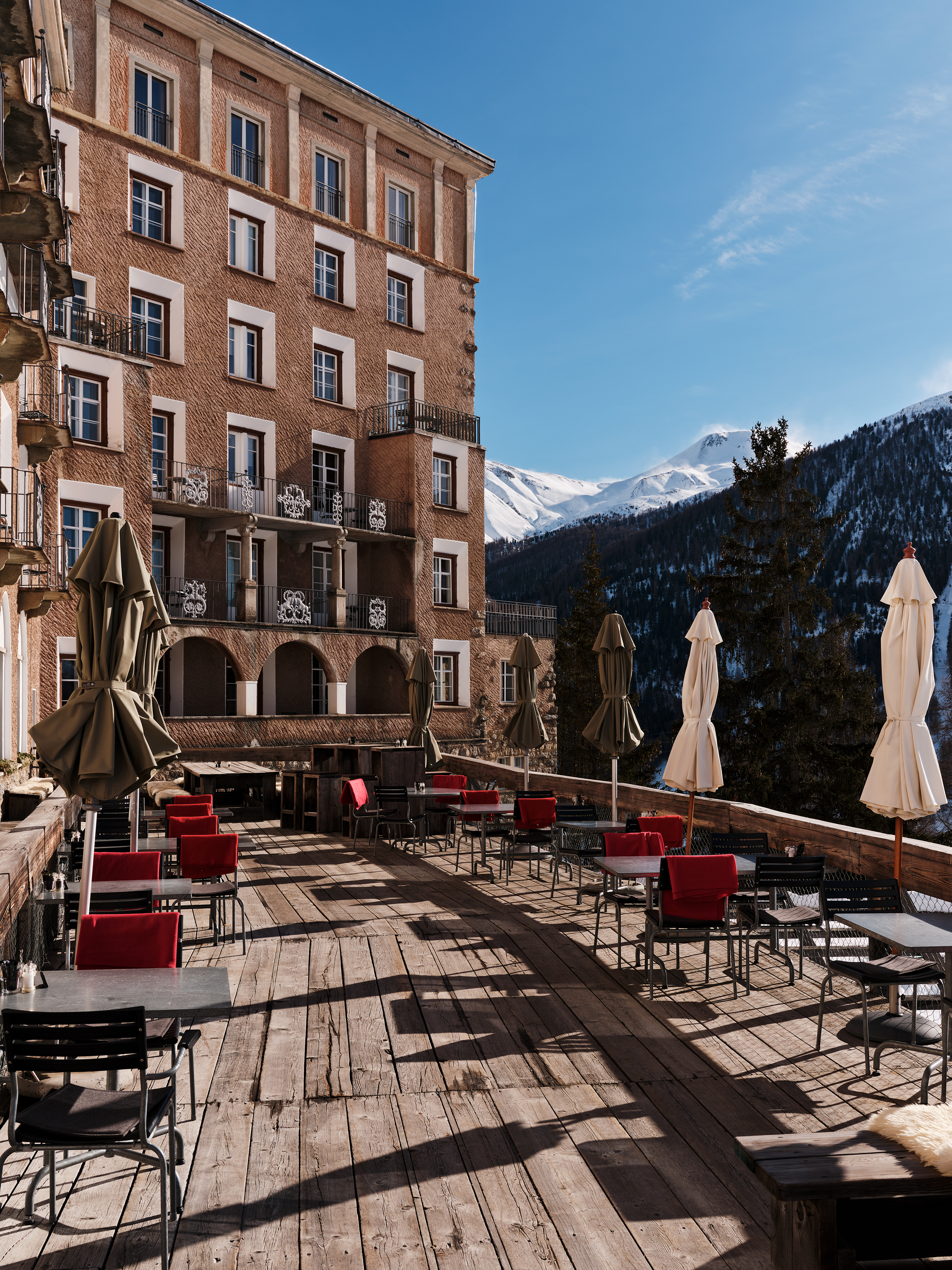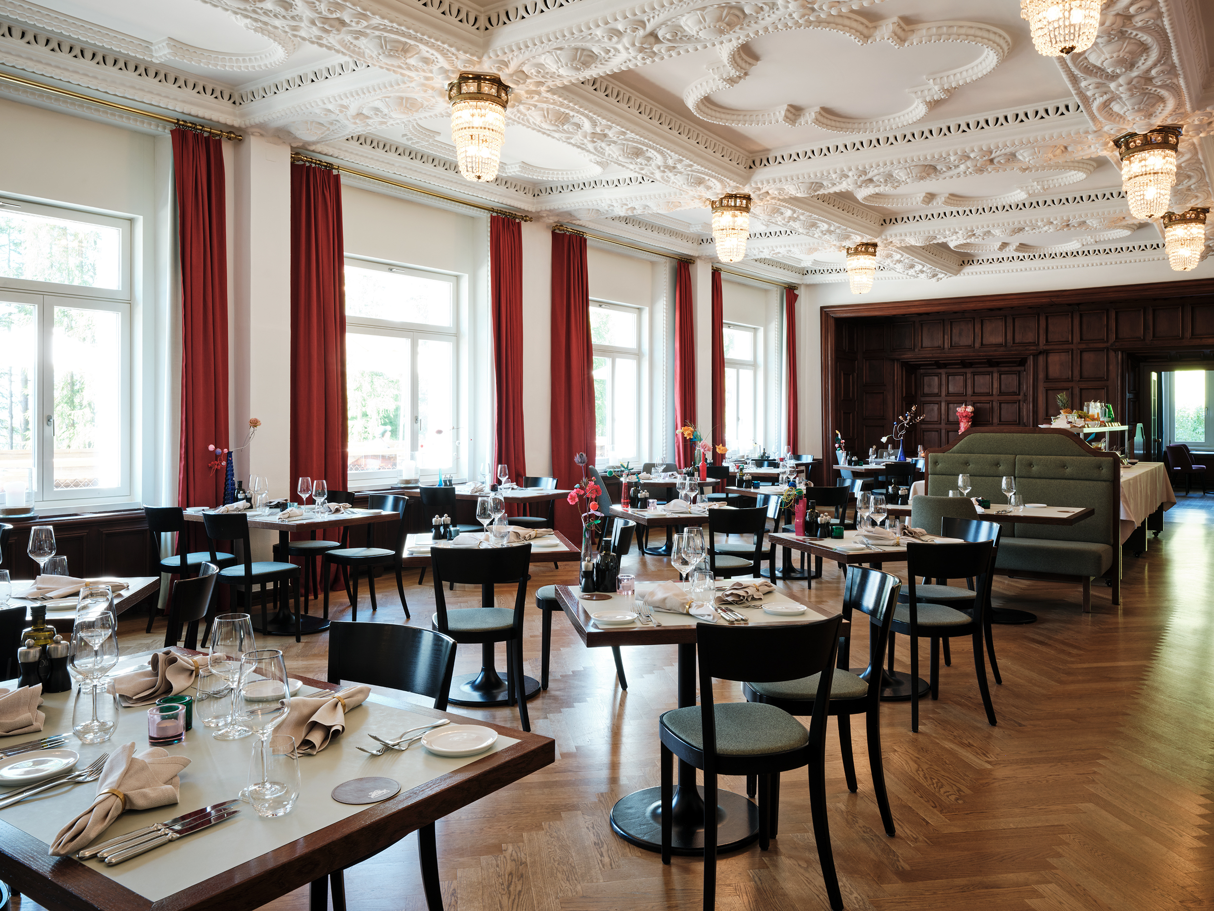 Das Belvair ist eine sinnvolle Verlängerung des Festsaals, gestaltet von Nicolas Party. Die grosszügige Fensterfront gibt Ausblick auf die Engadiner Natur und bietet dem Raum viel natürliches Licht.