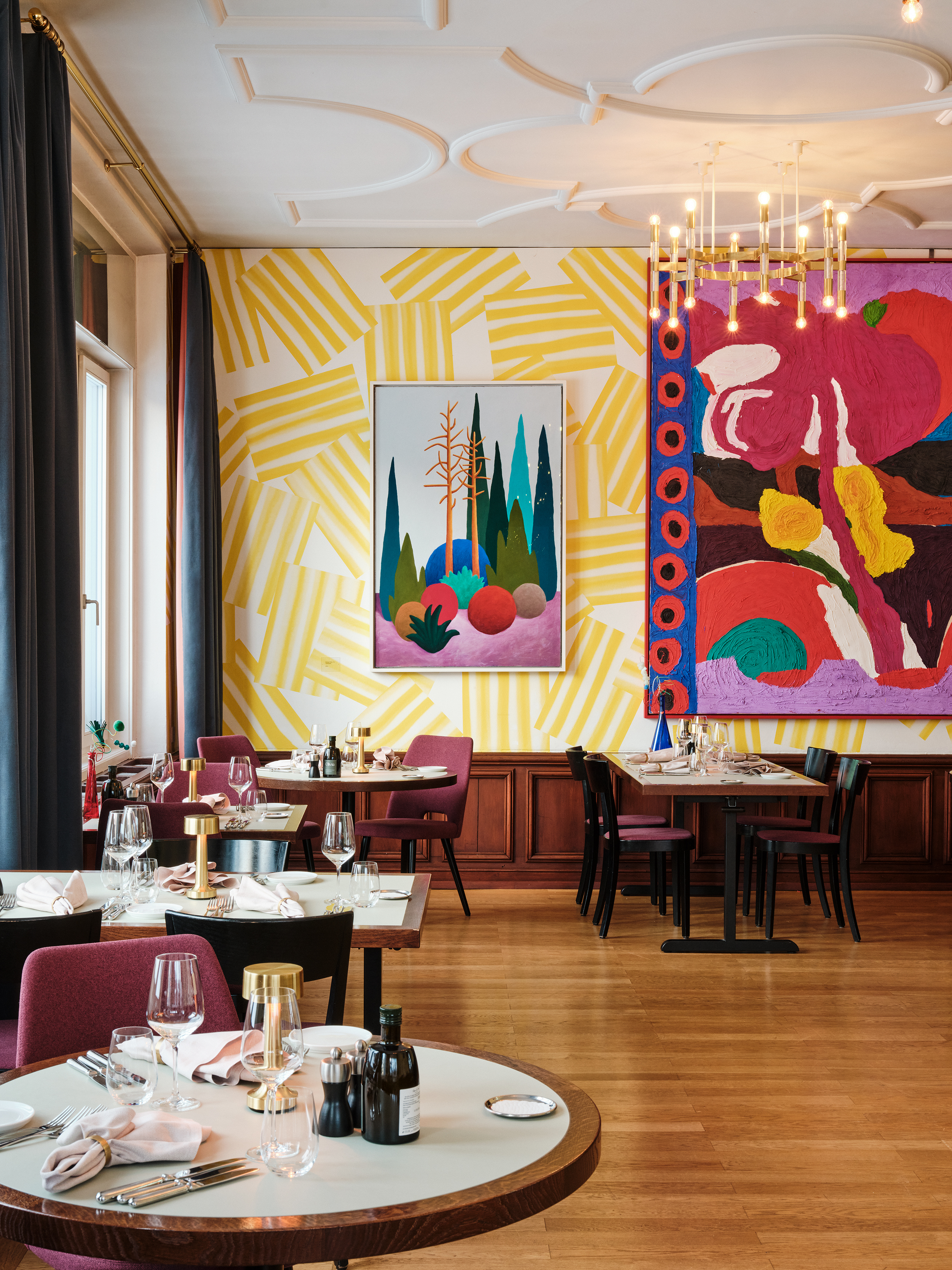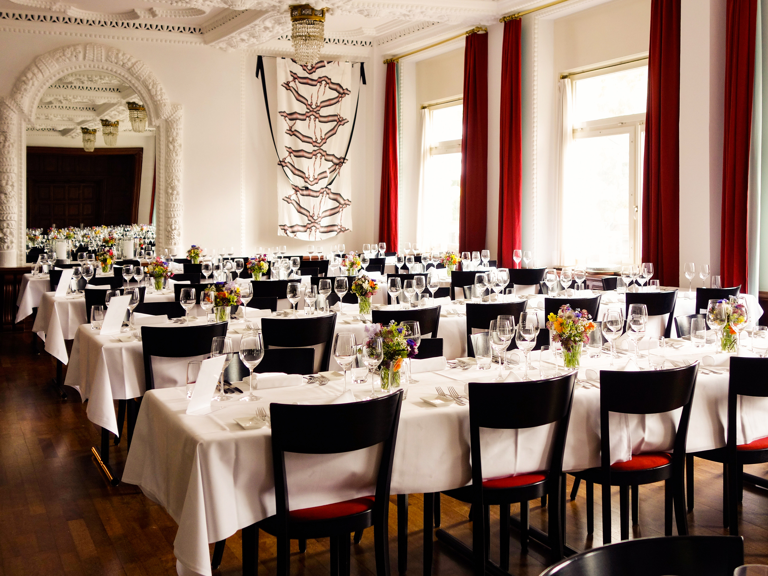 Im Jugendstil-Saal mit seiner kunstvollen Stuckdecke wird gespeist und gefeiert – ein Raum, der Geschichte und Genuss vereint.