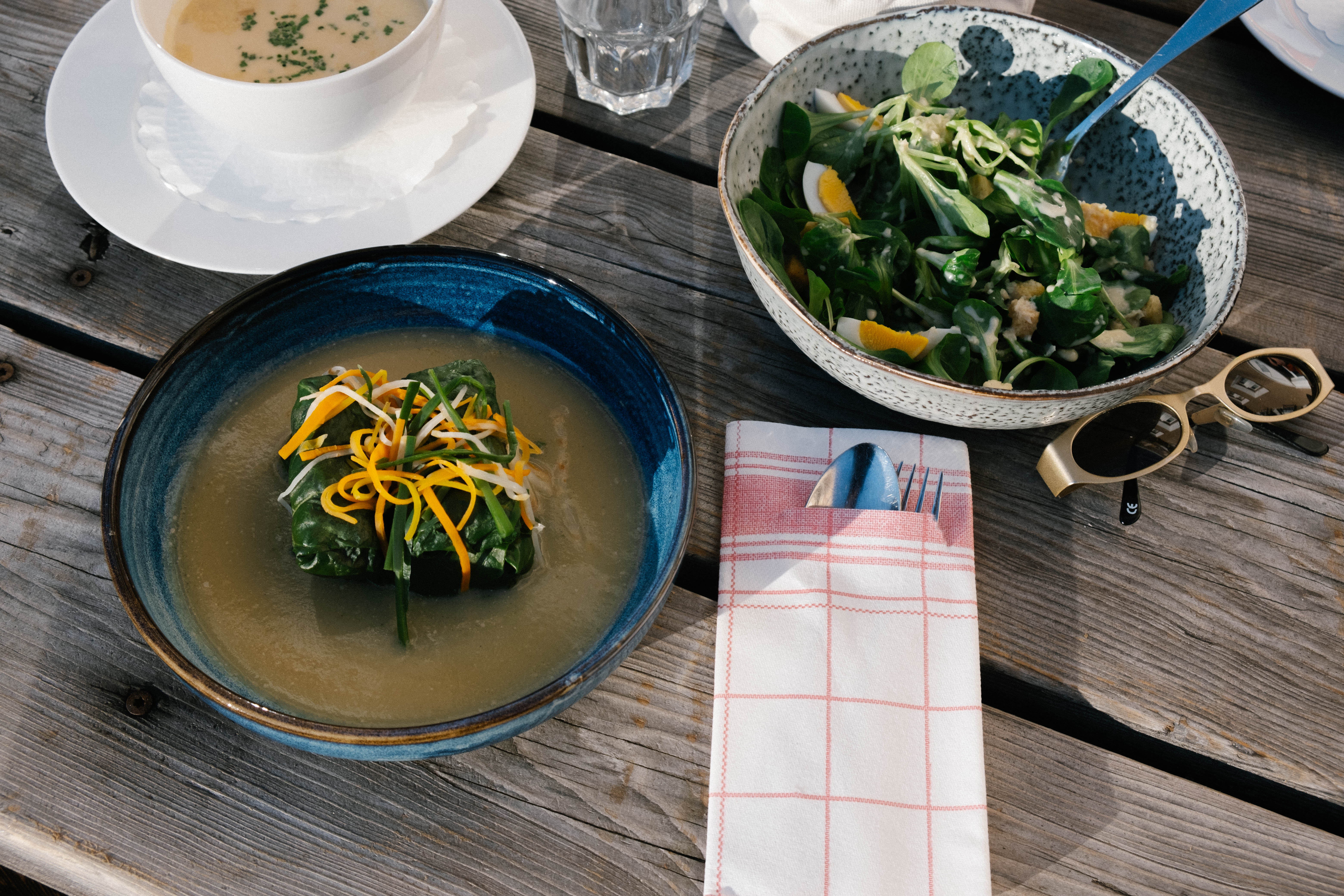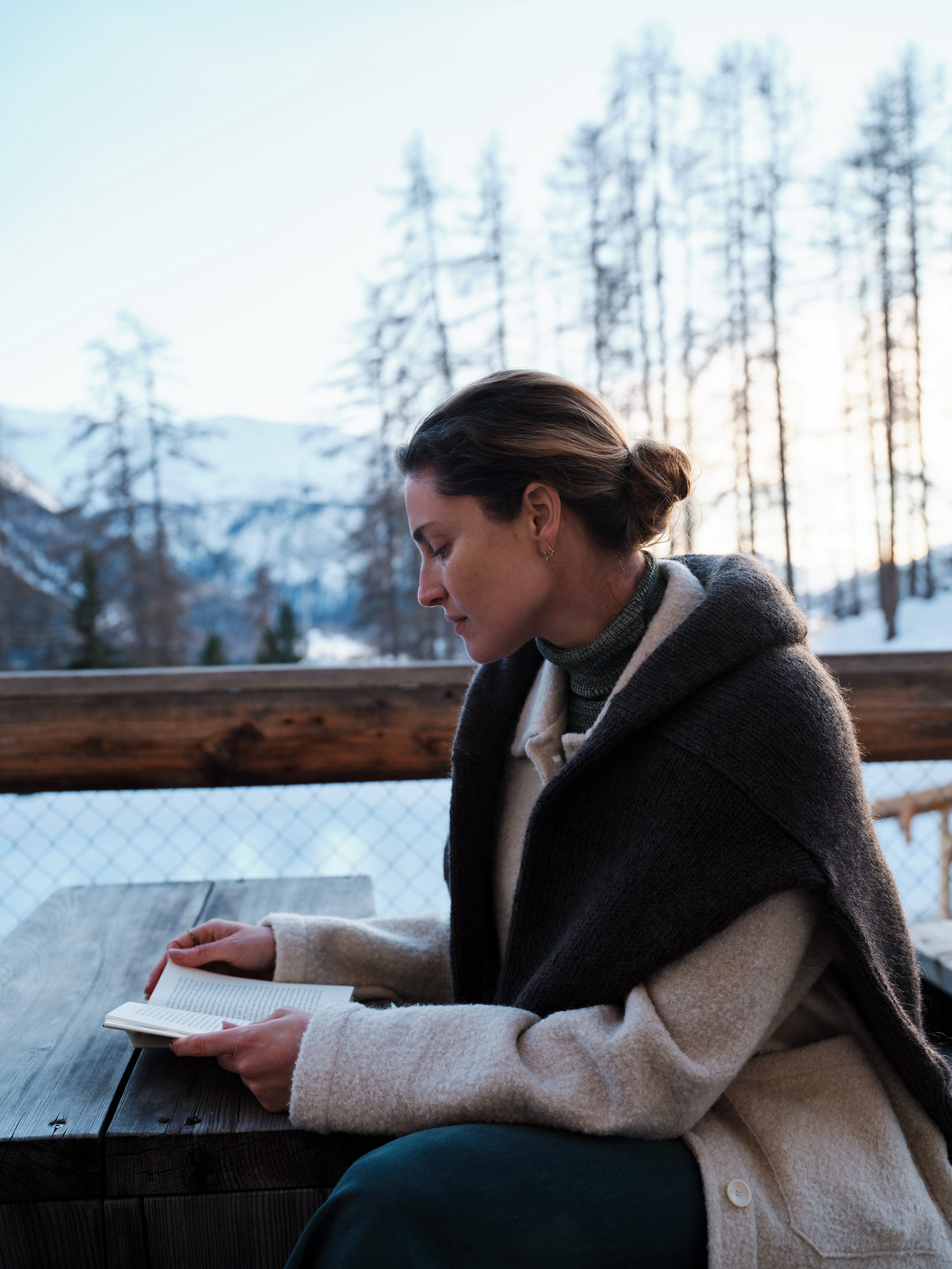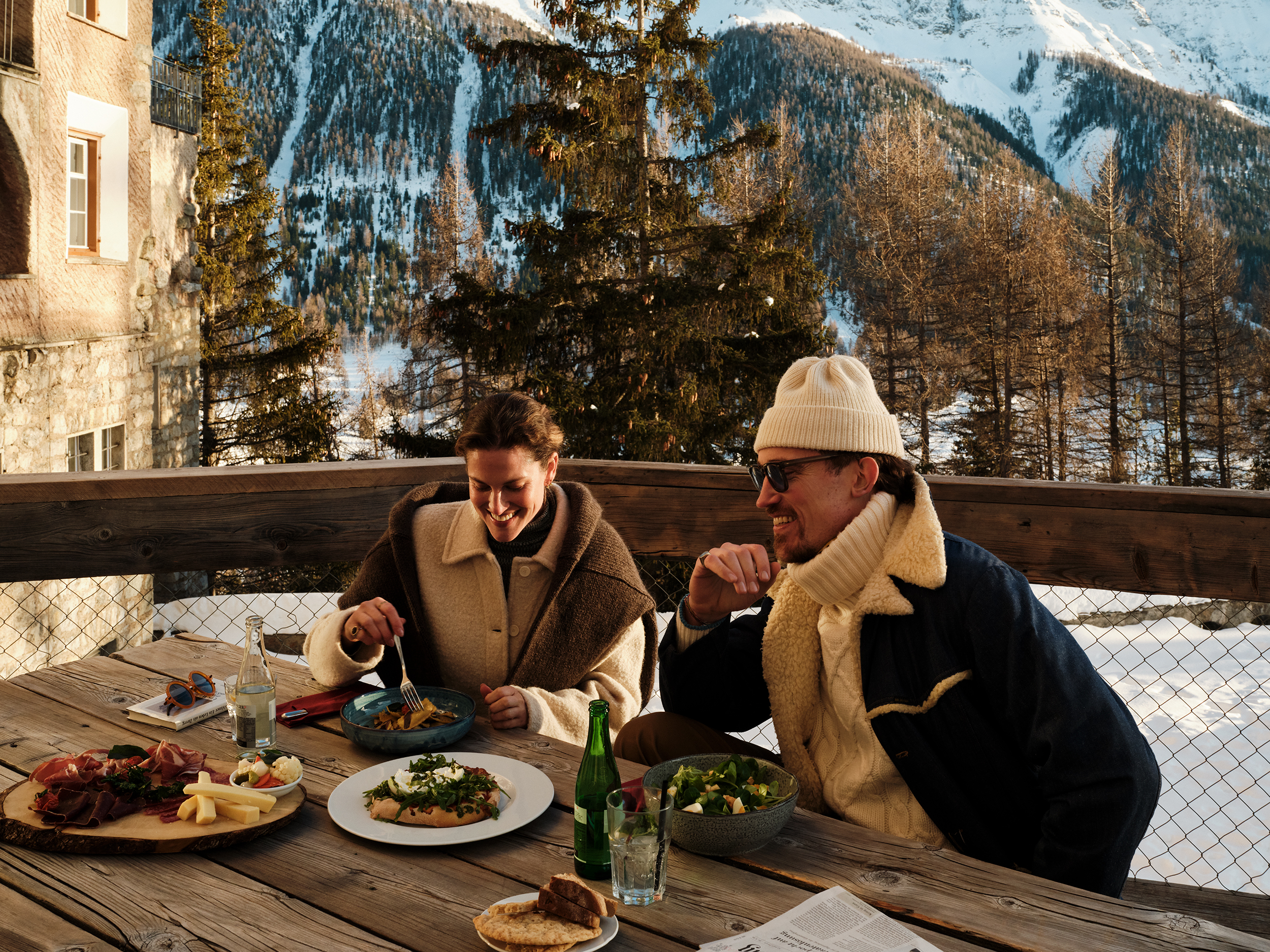 Nachmittags erwärmen die Sonnenstrahlen die Terrasse und das Gemüt. Die einfache Holzkonstruktion und die eindrucksvolle Kulisse verschmelzen zu einem harmonischen Gesamtbild, als wäre es schon immer genau so gewesen.
