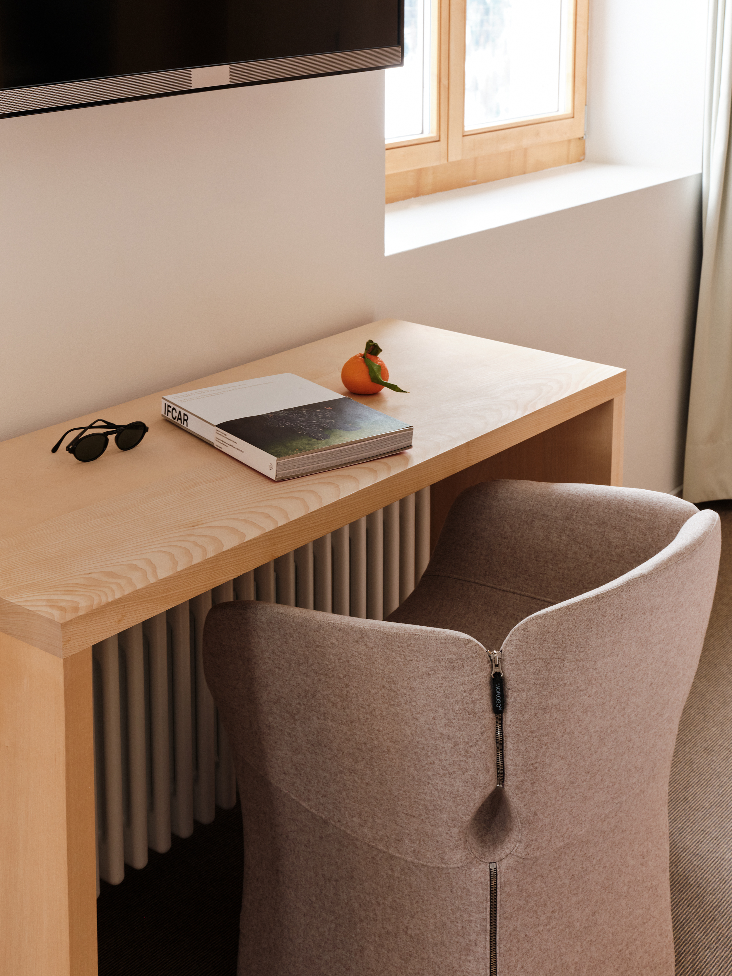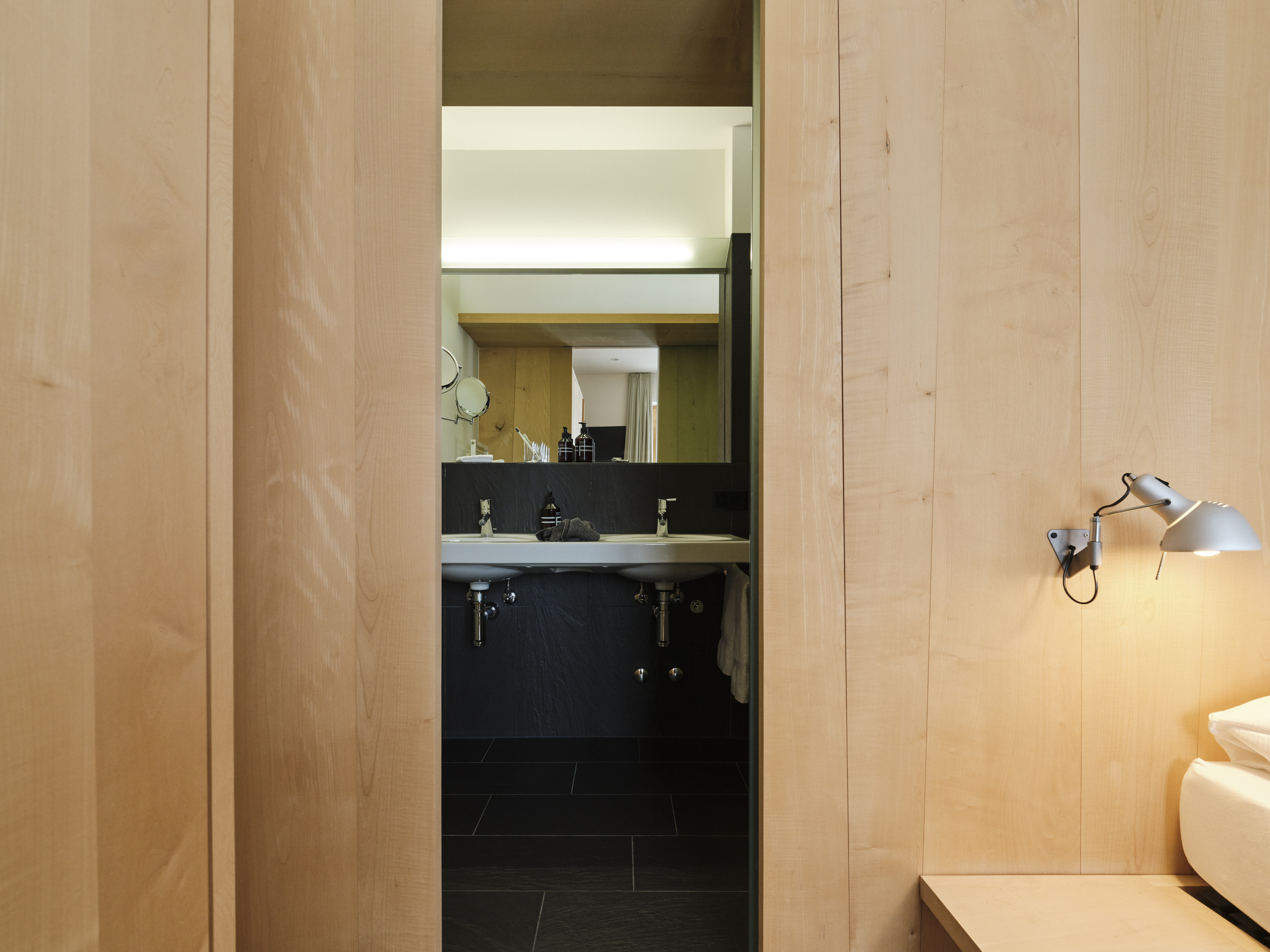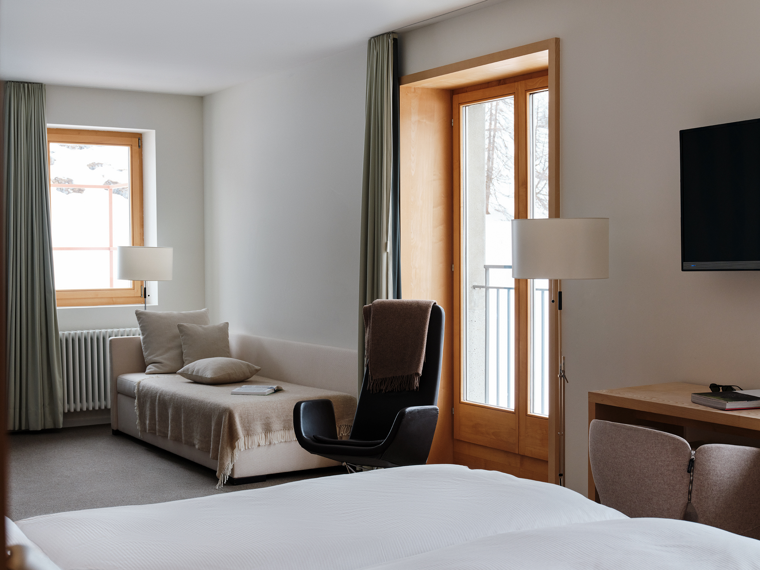 Die 40 m² grosse Suite ist lichtdurchflutet und ausgestattet mit einer gemütlichen Sitzecke, begehbarem Kleiderschrank und einem Badezimmer. Die Fenster rahmen den Blick auf die Alpwiesen rund um das Castell Zuoz und sorgen für ein freundliches und lichtes Ambiente.